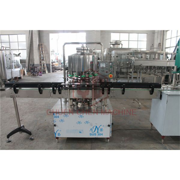 Automatic capping machine connects with transporter. Bottle is transported to sealing machine by conveyer belt, after sealed, passed by medium stand, transported to capping machine by conveyer belt, automatic cap-dropping equipment drops cap very well to seal cap. After sealing, conveyor belt puts out bottle and bottles are packed in a box